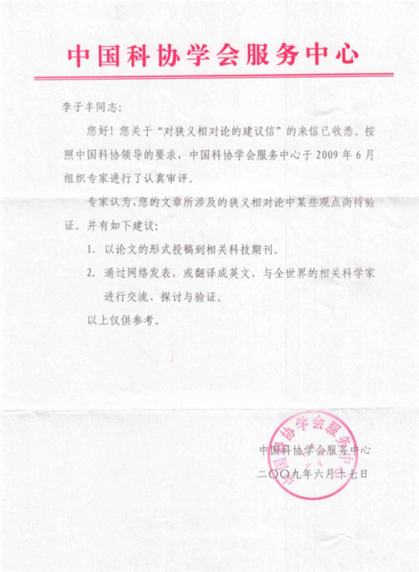 中國科協(xié)回函表示,針對李子豐的“狹義相對論的建議信”已收悉。按照中國科協(xié)領(lǐng)導(dǎo)要求,中國科協(xié)學(xué)會服務(wù)中心于2009年6月組織專家進行了認(rèn)真審批。專家認(rèn)為,李子豐的文章涉及狹義相對論中的某些觀點尚待驗證,并建議李子豐,以論文的形式投刊到相關(guān)科技期刊,或通過網(wǎng)絡(luò),或翻譯成英文,與相關(guān)科學(xué)家進行交流、探討與驗證。