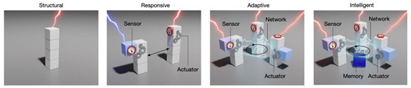 研究人員認為,可以通過用分層的方式定義人工物質的智能。比如,通過結合四個關鍵功能元件來實現(xiàn)智能物質:(1)傳感器與環(huán)境交互并接收輸入和反饋;(2)執(zhí)行器對輸入信號做出響應并調整材料的性能;(3) 用于長期存儲信息的存儲器;(4)用于處理反饋的通信網(wǎng)絡。