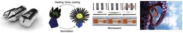 從結構到功能和復雜性日益增加的智能物質的概念轉換:合成后不能改變其性質,如純硅;光響應記憶合成材料向日葵環(huán)境自適應的打開和關閉;章魚的觸手,帶有嵌入式傳感器、執(zhí)行器和神經(jīng)系統(tǒng)(來源:Nature)
