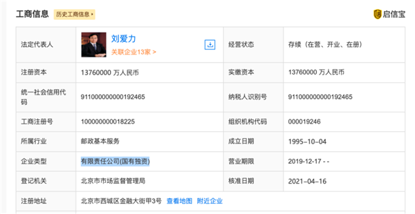 另據啟信寶數據顯示,中國郵政集團由國務院100%控股,成立于1995年,注冊資本為1376億元,法人代表是劉愛力。