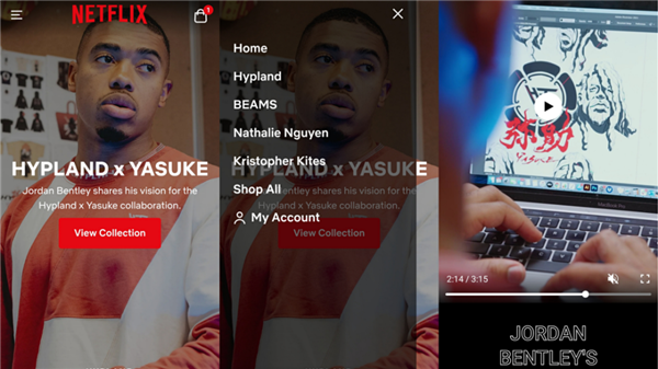 依次為Netflix.shop首頁、欄目導航、設計理念視頻