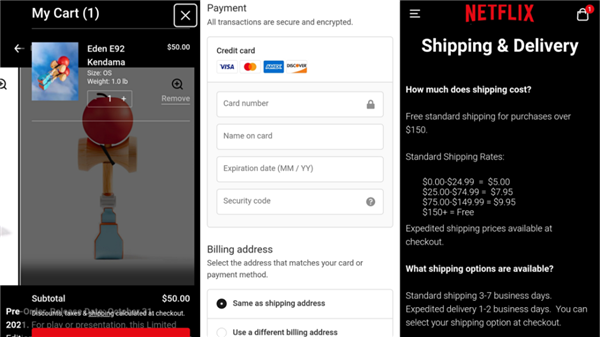 在購買方式上,Netflix.shop和奈飛原本的流媒體平臺賬號并不通用,非奈飛訂閱用戶也可以購買。配送則有標準配送和加急配送兩種選擇,前者大約3-7個工作日送達,后者1-2個工作日就能送達,不同的消費標準對應不同的運費,150美元以上可包郵。支付方式上目前只支持信用卡支付,消費者還可以選擇勾選郵件推送,從而獲得商品打折、促銷優惠的信息。