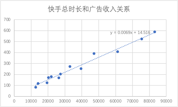 我們不妨用快手做對比,短視頻與B站共通性要更大一些,在快手的廣告收入模型中,我們測算了季度用戶使用總時長與廣告收入的關系,見下圖