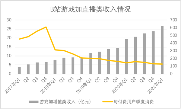 在過去的四年多時間里,B站ARPU以及總營收均得到不同程度的提高,但我們也發現, 2021年Q1總營收是2017年同期10倍,與此同時,ARPU僅是兩倍有余。
