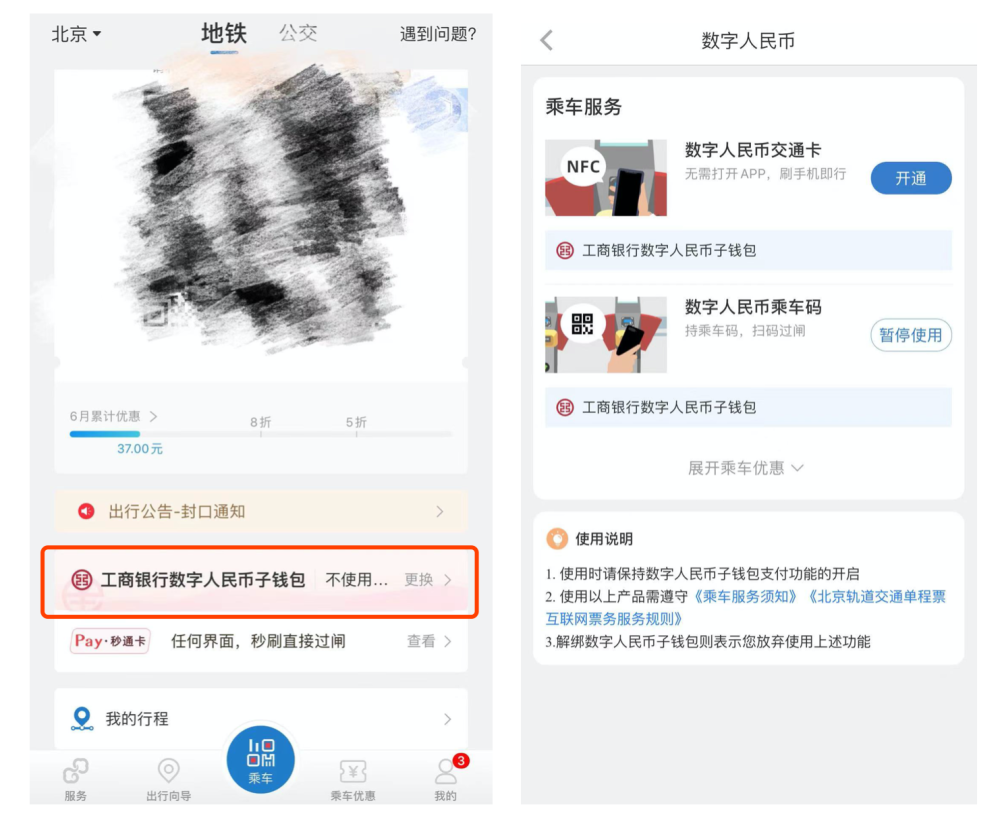 此次只需在工行數(shù)字人民幣“子錢(qián)包”中點(diǎn)選北京地鐵服務(wù)APP“億通行”,將兩者綁定之后,即可在“億通行”乘車碼頁(yè)面看到“數(shù)字人民幣專區(qū)”。