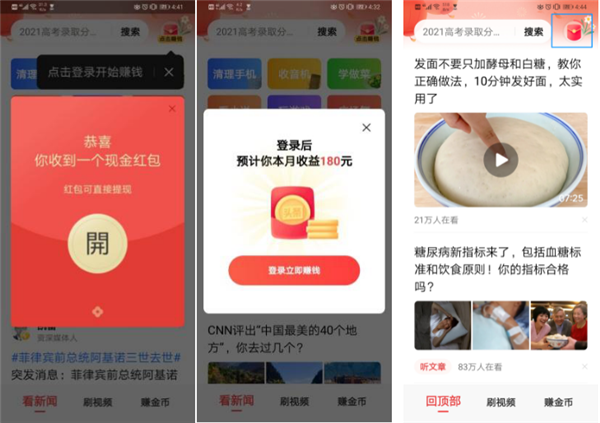 今日頭條與抖音同屬于字節系,兩個平臺的內容屬性、推薦原理具有極大的相似性。今日頭條大字版已經上線,光子星球使用后發現,打開APP首先跳出來的是一個待開的紅包,一時間誤以為自己進了拼多多,繼續操作發現,平臺是想通過紅包引導用戶注冊登錄,玩著刷內容賺錢的老套路。