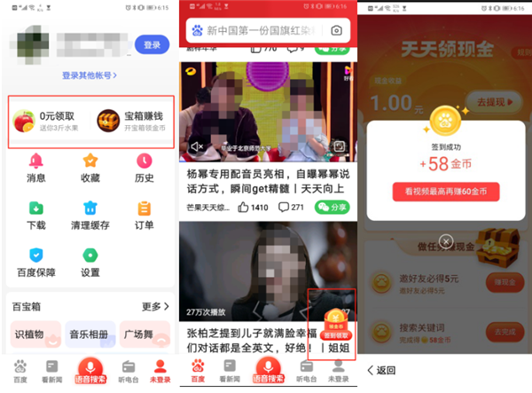 另外,百度作為搜索工具,也在有意“留住”老年用戶,簡化頁面后著重突出了看新聞、聽電臺、以及搜索等功能。同時還添加了0元領水果、簽到領金幣等小游戲,以此增加用戶活躍度和使用時長。