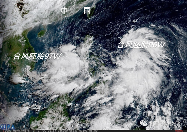 7月4日白天,西北太平洋上有兩個(gè)臺(tái)風(fēng)胚胎快速發(fā)展。其中,菲律賓以東洋面上的臺(tái)風(fēng)胚胎,編號為96W;我國南海上的臺(tái)風(fēng)胚胎,編號為97W。