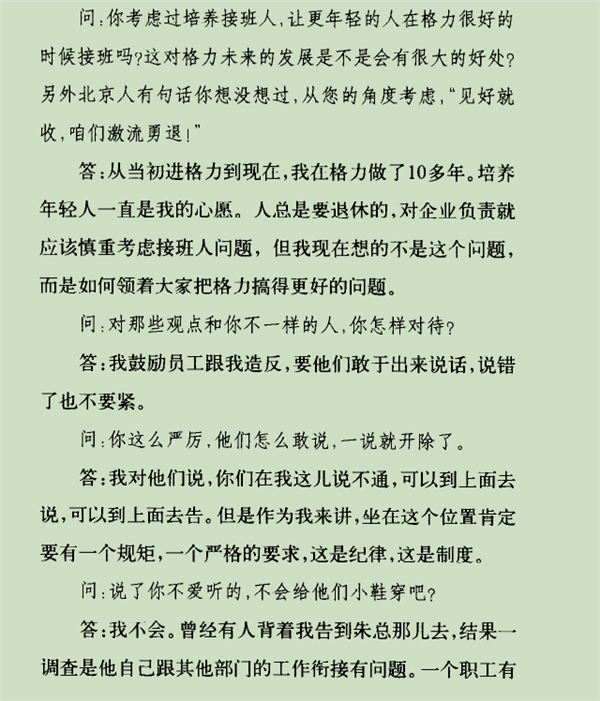 其實,關于接班人的話題,董明珠最早的回答應該還在出書時代。在2006年出的《行棋無悔》一書里,有人問她接班人: