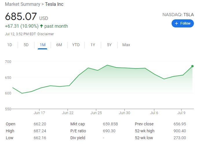 特斯拉盤中最高漲4.6%,股價至6月28日以來的兩周高位。