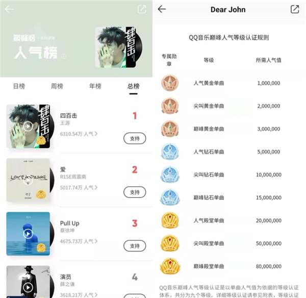 另一方面,打賞的樂幣數(shù)量直接等同于人氣值,反映到人氣排行榜,不同的人氣值還會讓單曲有不同的認證,充分迎合了粉絲的心理。這或許也是為什么QQ音樂的打投榜單上排名靠前的都以偶像為主。