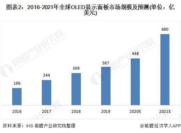 根據(jù) IHS 發(fā)布的數(shù)據(jù),2019 年 OLED 面板全球出貨量達(dá) 7.34 億片,比 2018 年上升了近 20%,預(yù)測(cè)2021 年 OLED 顯示面板市場(chǎng)規(guī)模收益達(dá)到 680 億美元。