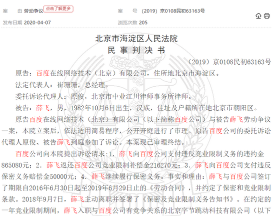 北京市海淀區法院的一份判決書顯示,2013年4月24日,薛飛入職百度,在百度公司擔任搜索生態業務部高級經理,于2018年9月7日離職。百度工作期間,雙方簽署的勞動合同中包含保守商業秘密及競業限制。
