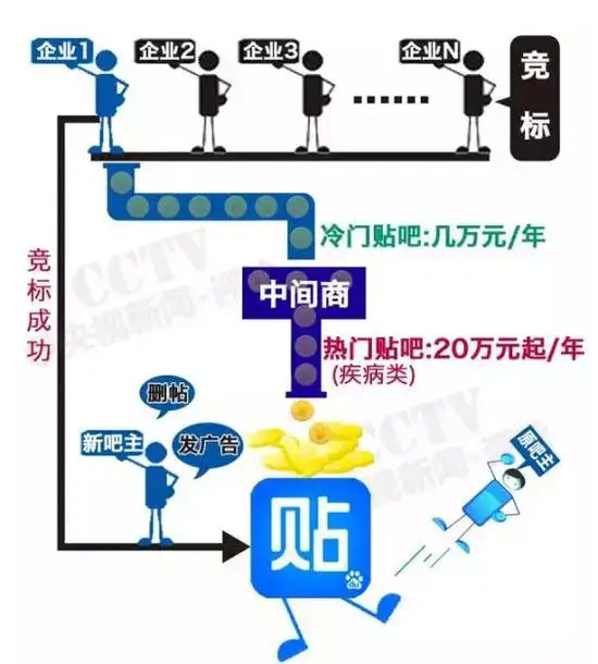 據北青網的調查,百度將貼吧交由運營商做競價排名,一般冷門貼吧的吧主價格在幾萬左右,如果要承包病種類的貼吧,需要通過競標的方式,價格一般一年不會少于20萬。