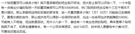 對吧主而言,更大的收益來自流量變現。據一位擔任過吧主的知乎網友介紹,有一點商業價值的中型貼吧一天的置頂費用1000元左右,熱門貼吧的可達到三五千元。