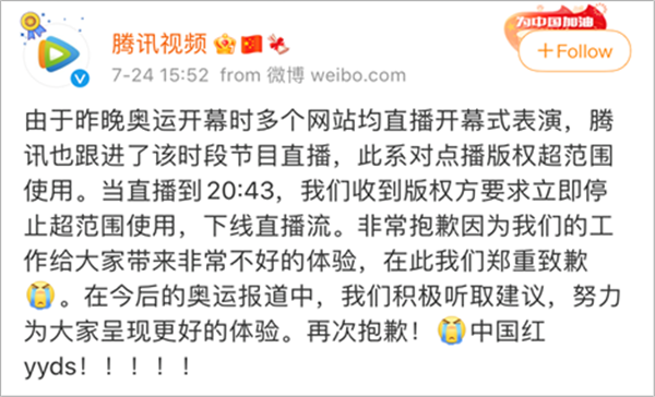 第二天下午,騰訊視頻官方微博作出回應,表示“由于昨晚奧運開幕時多個網站均直播開幕式表演,騰訊也跟進了該時段節目直播,此系對點播版權超范圍使用。當直播到 20:43,我們收到版權方要求立即停止超范圍使用,下線直播流。”