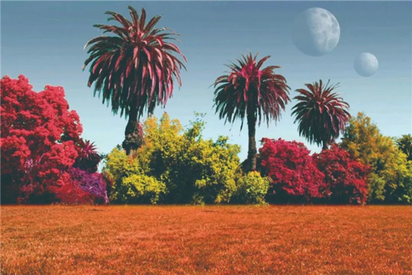 比如F型恒星更大、更熱,并發出更多高能光,受到F型主序星光照射的植物會得到大量的藍光,很可能反射過多的高能光子,因此在F型主序星周圍的行星上的植物可能是藍色的。而M型恒星更小、更冷,發射低能光子。M型恒星周圍的行星上,光子非常寶貴,這可能促使那里的光合生物進化出吸收不同光譜的能力。這意味著,如果我們有機會到一顆圍繞M型恒星的系外行星去,說不定我們會看到長滿五顏六色葉子的植物,甚至可能看到吸收所有可見光譜的黑色植物。