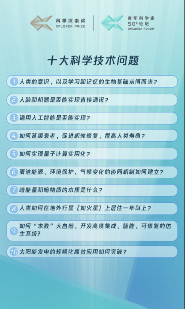 本次活動的一個亮點,就是發布2021年青年科學家50 論壇“十大科學技術問題”,由100位“科學探索獎”獲獎者共同發起和投票選出,代表了中國青年科技工作者的前沿科學洞察,問題涵蓋人類意識、人機通訊、量子計算實用化、地外行星居住等學術界和社會共同關心的熱點領域。主辦方表示,“十大科學技術問題”的發布,未來將成為“青年科學家50 論壇”的“招牌”,既集聚中國當代青年科學家的思考和觀察,也將為社會大眾所關心的現實和未來問題提供科學映照。