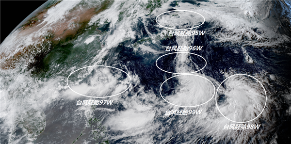 這涌動的熱帶云團其實正是季風活躍拉動起來的強盛季風槽,在這道季風槽中,臺風胚胎正在大量涌現。衛星云圖上可見,今天下午西太平洋一共有5個臺風胚胎正在活動,一個是位于日本以東洋面的臺風胚胎95W,一個是位于硫磺島附近的臺風胚胎96W,一個是我國臺灣附近的臺風胚胎97W,一個是位于美國關島西北方的臺風胚胎99W以及位于美國東北方的臺風胚胎98W。