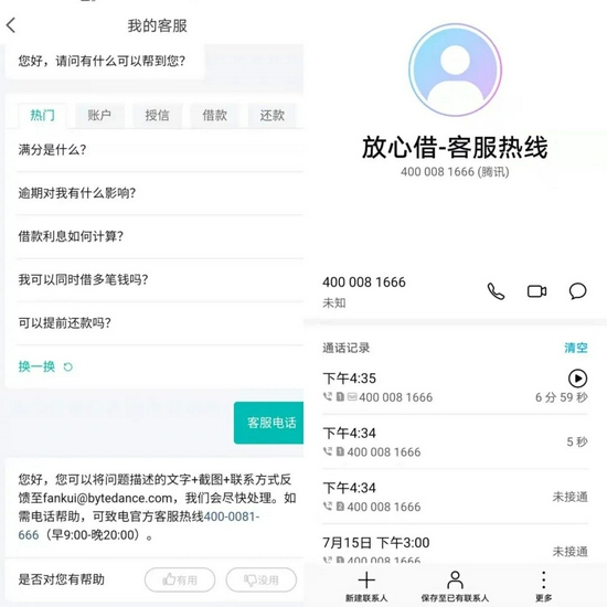 如今,“滿分”已經無法在華為應用市場搜索到,《新言財經》在網頁搜索頁面下載了“滿分”的歷史版本,撥打App內的客服電話,顯示竟然是“放心借-客服熱線”。