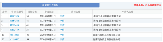 根據《新言財經》掌握的信息,2019年,一家名為“海南飛魚信息科技有限公司”的公司成立,公司兩位高管朱一立和俞鑫為字節的員工。據中國商標網顯示,從2020年開始該公司就注冊了“字信”的多個商標,涉及36類金融物管,今年7月,仍在申請“字信”商標。