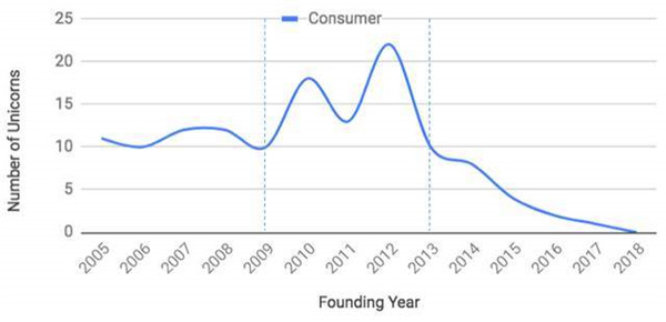 KPCB合伙人Eric Feng在2018年曾發過一篇文章,叫做《消費已死,消費長存》(Consumer startups are dead. Long live consumer startups.)。在這篇文章中,他曾指出,消費創業在經歷了2009年-2013年的黃金時代之后,慢慢滑入低谷,隨著黃金時代建立的企業慢慢站穩腳跟、成為巨頭,到他發文的2018年,消費創業企業已經歸零。