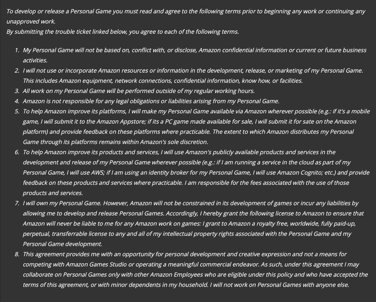 第 7 條政策聲明:“我將免費(fèi)、全球、完全付費(fèi)、永久、可轉(zhuǎn)讓地授權(quán)給亞馬遜以獲得與我的個人游戲和我的個人游戲開發(fā)相關(guān)的任何知識產(chǎn)權(quán)。”換言之,負(fù)責(zé)獨(dú)立游戲項目的員工必須將自己的 IP 免費(fèi)轉(zhuǎn)讓給亞馬遜。