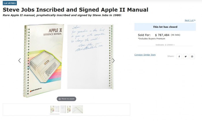 本屆 RR Auction 拍賣會上,除了罕見、尚能運行的 Apple-1 電腦以約合 240 萬人民幣成拍之外,還有多款非常有價值的蘋果相關產品被拍賣。其中由史蒂夫·喬布斯(Steve Jobs)和邁克·馬庫拉(Mike Markkula)簽名的 Apple II 手冊共有 46 人出價,最終成拍價格為 787484 美元(約合 5119827.23 元)。