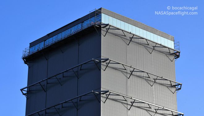 在三角形“防風艙”徹底完工幾個月后,SpaceX 開始建造更大的盒子狀建筑,最終被稱為星際飛船工廠的“中艙”(MidBay)。“中艙”高約 45 米,旨在支持星際飛船儲罐的多層鋼環組裝。但不知出于什么原因,這座“中艙”似乎太矮,無法支持整個星際飛船的組裝過程。取而代之的是,當星際飛船的儲罐部分組裝完成后,SpaceX 將不得不將其從“中艙”中移出,以便安裝鼻錐。