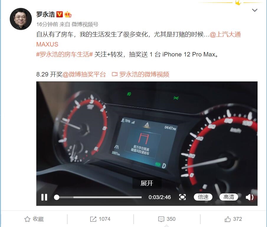 隨后羅永浩宣布代言上汽大通 MAXUS 原廠房車,這款車搭載了 HLC 限高防撞預警系統、ADAS 智能駕駛輔助系統以及博世 ESP 9.3 車身電子穩定系統等等,官網售價 61.98 萬元。