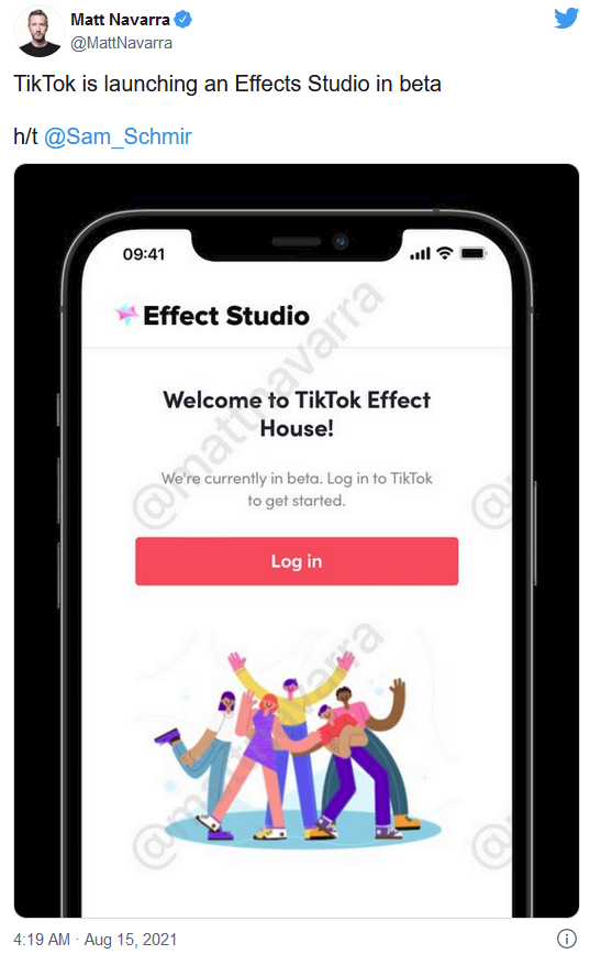 效果工作室是由社交媒體顧問馬特·納瓦拉首次發(fā)現(xiàn)的。你可以在這個地址查看注冊頁面(在這里它被初步命名為 TikTok 效果屋):