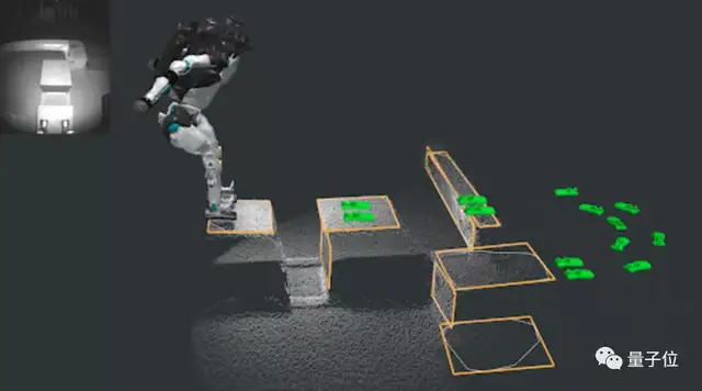 其中,Atlas會通過深度相機捕捉到紅外圖像(左上角),并從圖像數據中提取出點云,繪制出跑酷障礙物的表面(橙色輪廓)。