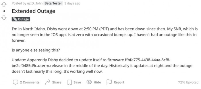 根據(jù) Reddit 用戶 ID_John 的說法,在他的服務(wù)中斷后,Starlink 的用戶終端,也被稱為 Dishy,在中間進(jìn)行了一次意外的軟件更新,之后服務(wù)恢復(fù)了,Starlink 也正常運(yùn)行了。