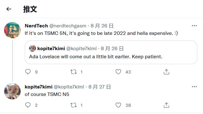 知名爆料人士 Kopite 近日分享了 NVIDIA 下一代 Ada Lovelace GPU 的關鍵細節。在他此前的爆料中已經確認 Ada Lovelace 架構建立在 5nm 工藝上,但此前推測是三星節點。而最新消息稱,NVIDIA 將代工服務建立在臺積電的 5nm 生產工藝上。