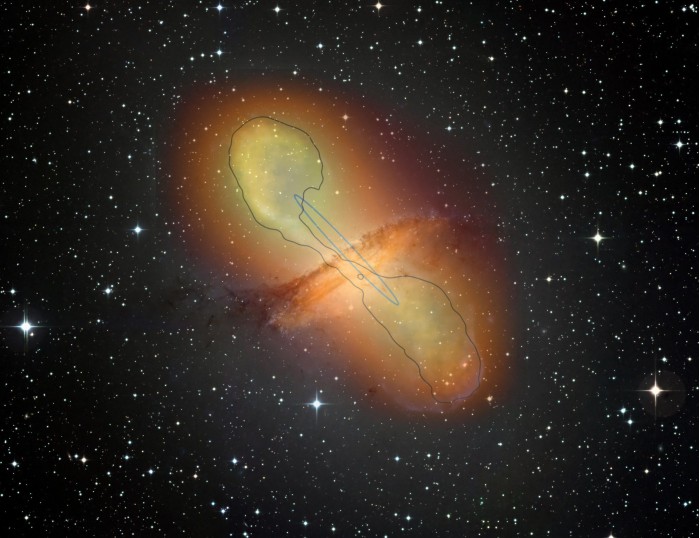 半人馬座A的綜合圖像,顯示了從該星系的中心黑洞中出現(xiàn)的噴流,以及相關(guān)的伽馬輻射。