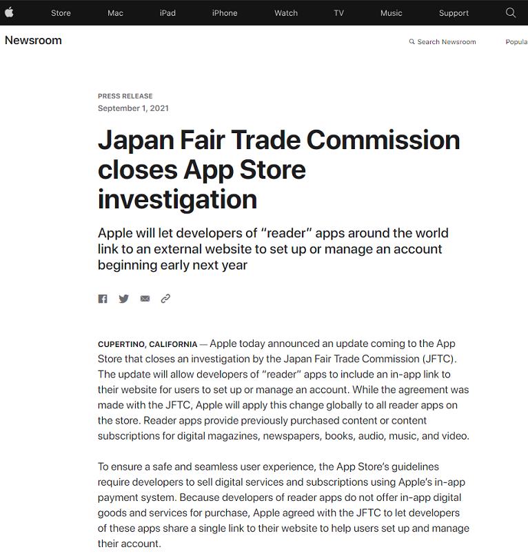 允許開發者在 APP 外使用三方支付之后,北京時間 9 月 2 日,蘋果再度發布了一則公告,為了與日本公平貿易委員會達成調查和解,正式宣布“閱讀器”類 iOS 應用可以使用跳轉網站的方式,使用第三方支付,正式生效時間為 2022 年初、范圍為全球。