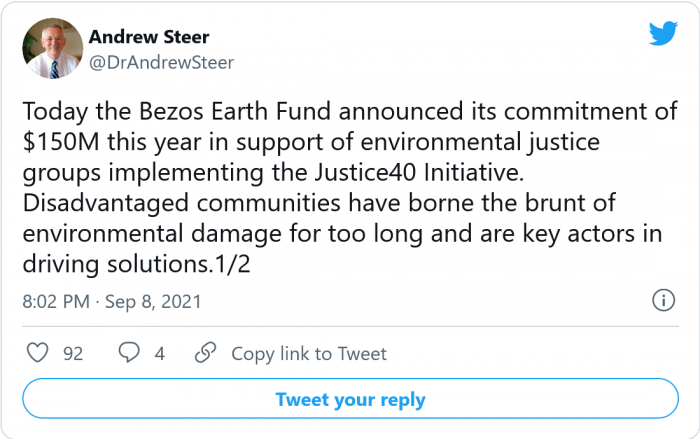 此前,貝佐斯因?yàn)闆](méi)有為處于氣候危機(jī)前線的社區(qū)撥出足夠的資金而遭到活動(dòng)人士的抨擊。在去年的第一輪捐贈(zèng)中,該基金向環(huán)保組織撥款 7.91 億美元。其中大部分資金都流向了大型環(huán)保組織,包括世界野生動(dòng)物基金會(huì)(WWF)和環(huán)境保護(hù)基金會(huì)(EDF),這些組織的資金比注重氣候正義的組織更雄厚。