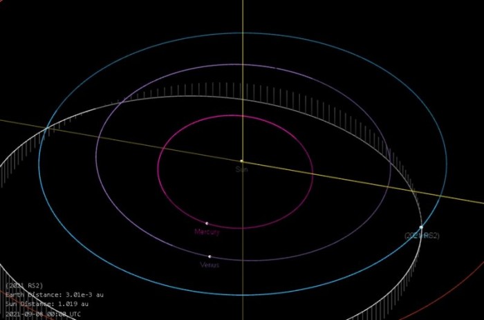 根據美國航空航天局(NASA)網站消息,北京時間 9 月 8 日下午 3 時 28 分左右,今年以來距離地球最近的一顆小行星與人類擦肩而過,最靠近時甚至比很多人造地球衛星更近。NASA 下屬的噴氣推進實驗室提供的數據顯示,這顆編號 2021 RS2 的小行星于 9 月 7 日才被發現,它的體積約卡車大小,估計直徑在 2.3-5.1 米左右。
