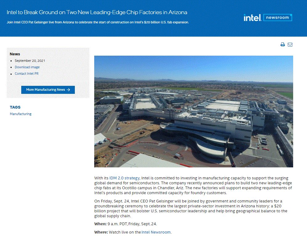 9月23日消息,根據處理器龍頭英特爾(intel) 官方公布的信息指出,英特爾將在美國亞利桑那州興建的兩座新晶圓廠,預計9月24 日進行動土奠基儀式,屆時英特爾CEO Pat Gelsinger 將會親自到場出席活動。