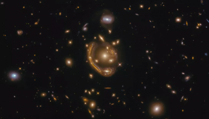 愛因斯坦環由著名物理學家阿爾伯特·愛因斯坦首次提出,是指一種由于光源發出的光線受到引力透鏡效應的影響,使觀測所得的光源形狀改變呈環形的現象。在這里,來自背景星系的光線不僅被扭曲,而且還被放大了 20 倍。這使得天文學家能夠獲得比目前現有技術所能提供的更好的星系外觀。事實上,這種效果相當于通過一個具有 157 英尺(48 米)孔徑的望遠鏡來觀察。