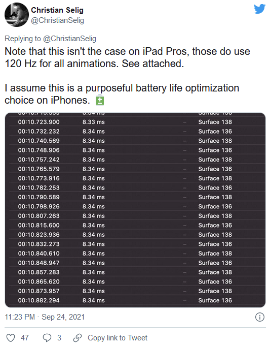 目前,由于對標準動畫的支持有限,像滾動這樣的互動和關閉彈出窗口這樣的互動之間會有明顯的區別。例如,如果你在 iPhone 13 Pro 或 Pro Max 上滾動瀏覽 Twitter,你會看到流暢的滾動體驗,但尚未更新到 120Hz 的動畫被限制在 60Hz,而這些動畫的流暢度明顯降低。這個反差問題將隨著開發者在未來采用對 ProMotion 功能的全面支持而得到解決。