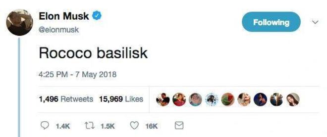 2018 年 4 月,馬斯克在推特上發了兩個詞,“Rococo basilisk(洛可可的蛇怪)”,玩了一把諧音梗,其原詞應該是“Roko’s Basilisk(羅科的蛇怪)”,后者是一個關于 AI 的荒謬論點。