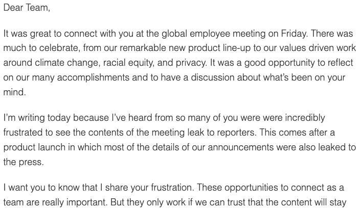 另外,蘋(píng)果在 9 月 17 日舉行了一場(chǎng)全體員工大會(huì),要求對(duì)未接種疫苗的員工進(jìn)行頻繁檢測(cè),但沒(méi)有強(qiáng)制要求接種疫苗。不料,這場(chǎng)大會(huì)的內(nèi)容也被泄露給了媒體。