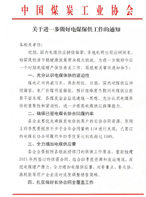 9月30日,中國煤炭工業(yè)協(xié)會、中國煤炭運銷協(xié)會發(fā)布通知,要求進(jìn)一步做好電煤保供工作,要求各企業(yè)要深挖電煤增產(chǎn)潛力,全力增加電煤供應(yīng)量,各企業(yè)要優(yōu)先確保發(fā)電供熱用戶的長協(xié)合同資源,原則上四季度要按照不少于全年合同量的1/4進(jìn)行兌現(xiàn),已簽訂的電煤長協(xié)合同履約率四季度要達(dá)到或超過100%。