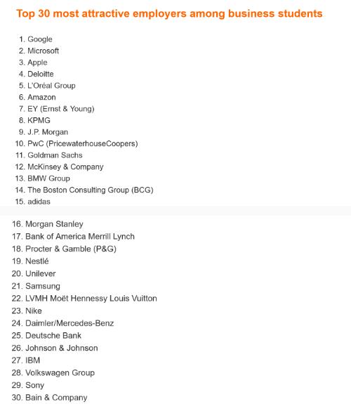 與 Google 一起躋身前五的是微軟、蘋果、德勤和歐萊雅集團(tuán)。報告還顯示,商學(xué)院畢業(yè)生更傾向于銀行和咨詢公司。排名前 20 的銀行中有一半是摩根大通和高盛這樣的銀行,還有麥肯錫公司和德勤這樣的咨詢公司。