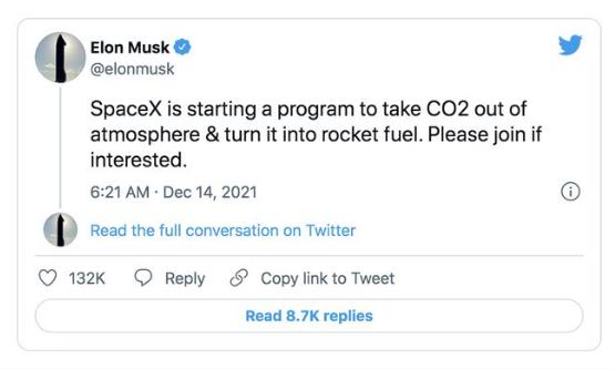 馬斯克發布推文稱,“SpaceX 正在啟動一項計劃,從地球大氣層中去除二氧化碳,并將其用作火箭燃料。”他補充說:“如果對這個項目感興趣,請加入我們。”