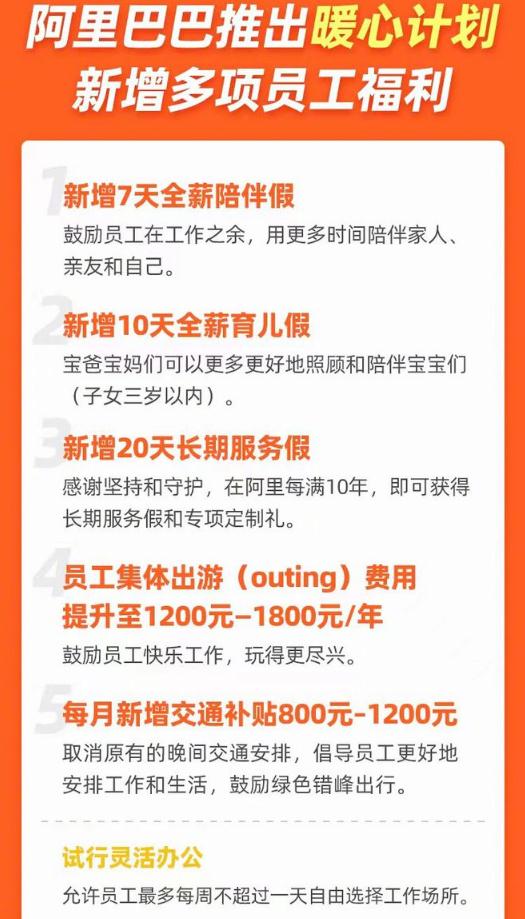 12 月 14 日消息,據悉,阿里巴巴今日在內網公布了多項針對員工關懷的“暖心計劃”,包含多項員工福利升級——除率先響應國家號召延長產假、新增育兒假外,并推出了 7 天全薪陪伴假、20 天全薪長期服務假,同時新增交通補貼倡導綠色錯峰出行,提高員工集體出游(Outing)費用標準。此外,阿里巴巴還將試行靈活辦公制度,允許員工每周最多一天可自由選擇辦公地點。