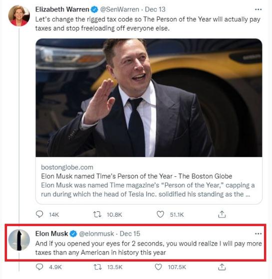 近日,據媒體報道,特斯拉 CEO 埃隆·馬斯克最近在回應美國參議員伊麗莎白-沃倫對他納稅問題的批評時聲稱,“只需睜開眼睛 2 秒鐘,就能知道我今年的納稅金額將超過歷史上任何一個美國人“。