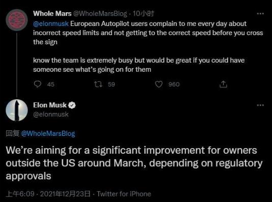 名為@WholeMarsBlog 的特斯拉車主發(fā)帖稱,歐洲許多特斯拉用戶抱怨稱,“Autopilot 不按規(guī)定限速,在通過交通標志前也沒有達到正確的速度。”馬斯克回應了這條推文,稱特斯拉 Autopilot 團隊的目標是根據(jù)監(jiān)管部門的批準,在明年 3 月份左右為非美國車主提供重大升級。