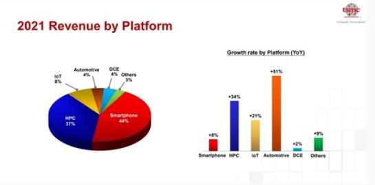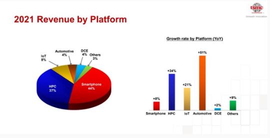 按平臺計算,臺積電 2021 年主要收入來源依舊來自于智能手機,其收入占比達 44%,其次是計算機,收入占比 37%,物聯網、汽車和數據通信設備分別占比8%、4%、4%。